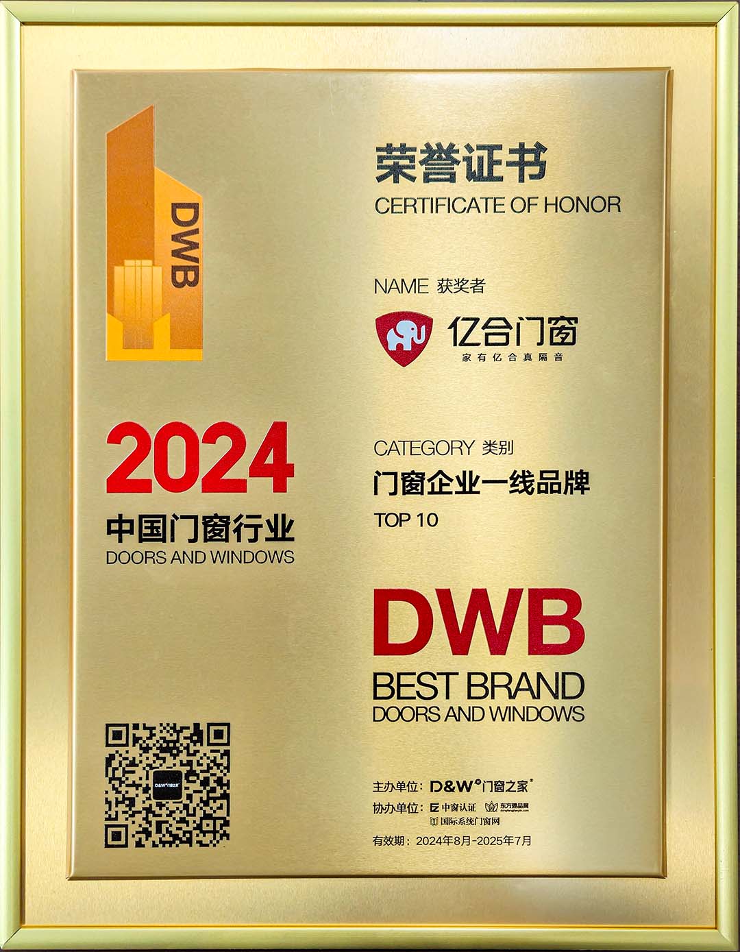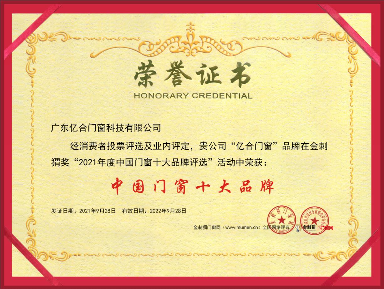 億合門窗榮獲“十大門窗優(yōu)選品牌”稱號