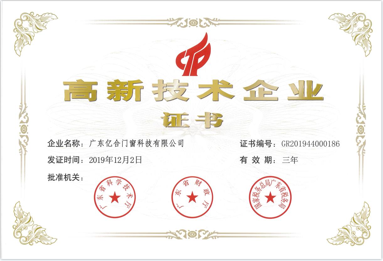 2016年億合門窗通過“國家高新技術(shù)企業(yè)”認(rèn)定