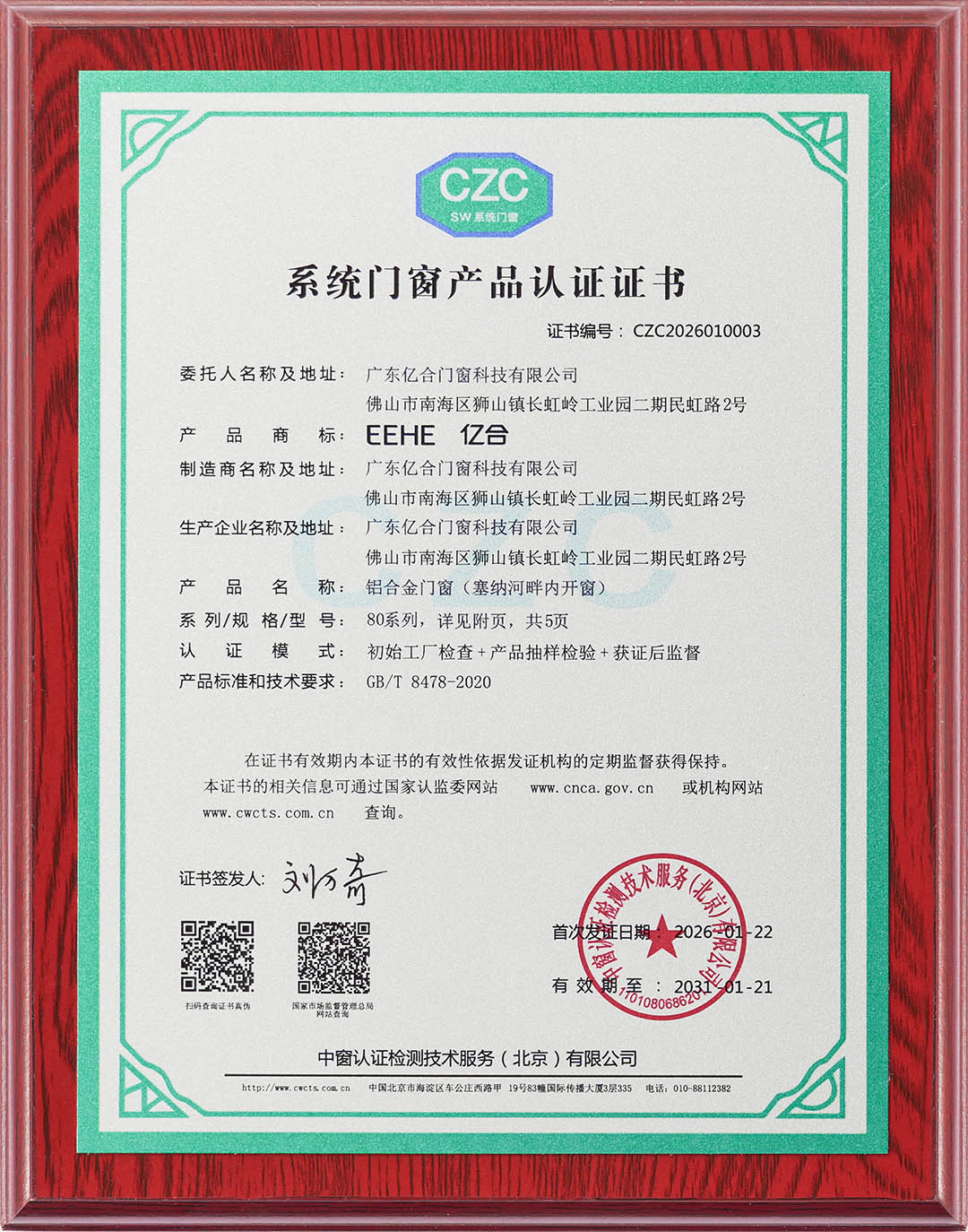 系統(tǒng)門窗產(chǎn)品認(rèn)證證書