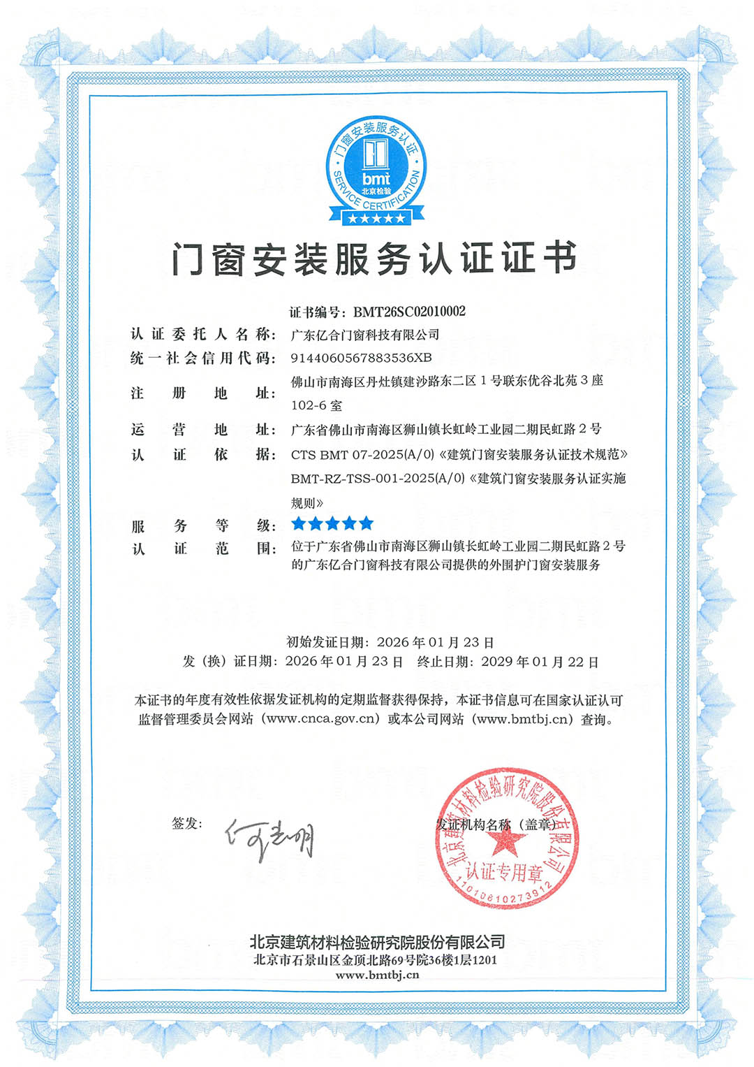 • 門窗安裝服務(wù)認(rèn)證證書