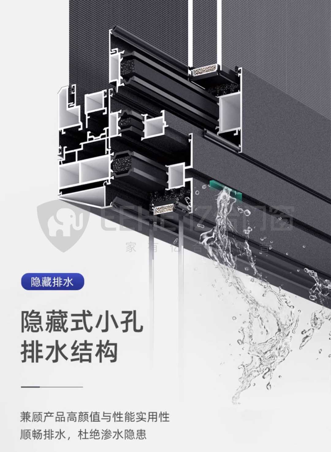 面臨暴雨天氣時(shí),如果門窗排水結(jié)構(gòu)設(shè)計(jì)不合理,則很容易出現(xiàn)雨水倒灌進(jìn)入室內(nèi)的情況。億合門窗以用戶日常使用需求為核心,全方位、多角度地對(duì)產(chǎn)品細(xì)節(jié)進(jìn)行升級(jí)與完善,采用腔內(nèi)式隱藏排水結(jié)構(gòu),將排水路徑隱藏于整窗外框里,避免大風(fēng)直吹造成雨水倒灌室內(nèi),不僅達(dá)到平整美觀度,更有效幫助迅速排水,哪怕在面對(duì)暴雨襲擊時(shí),也能做到“滴水不滲”。