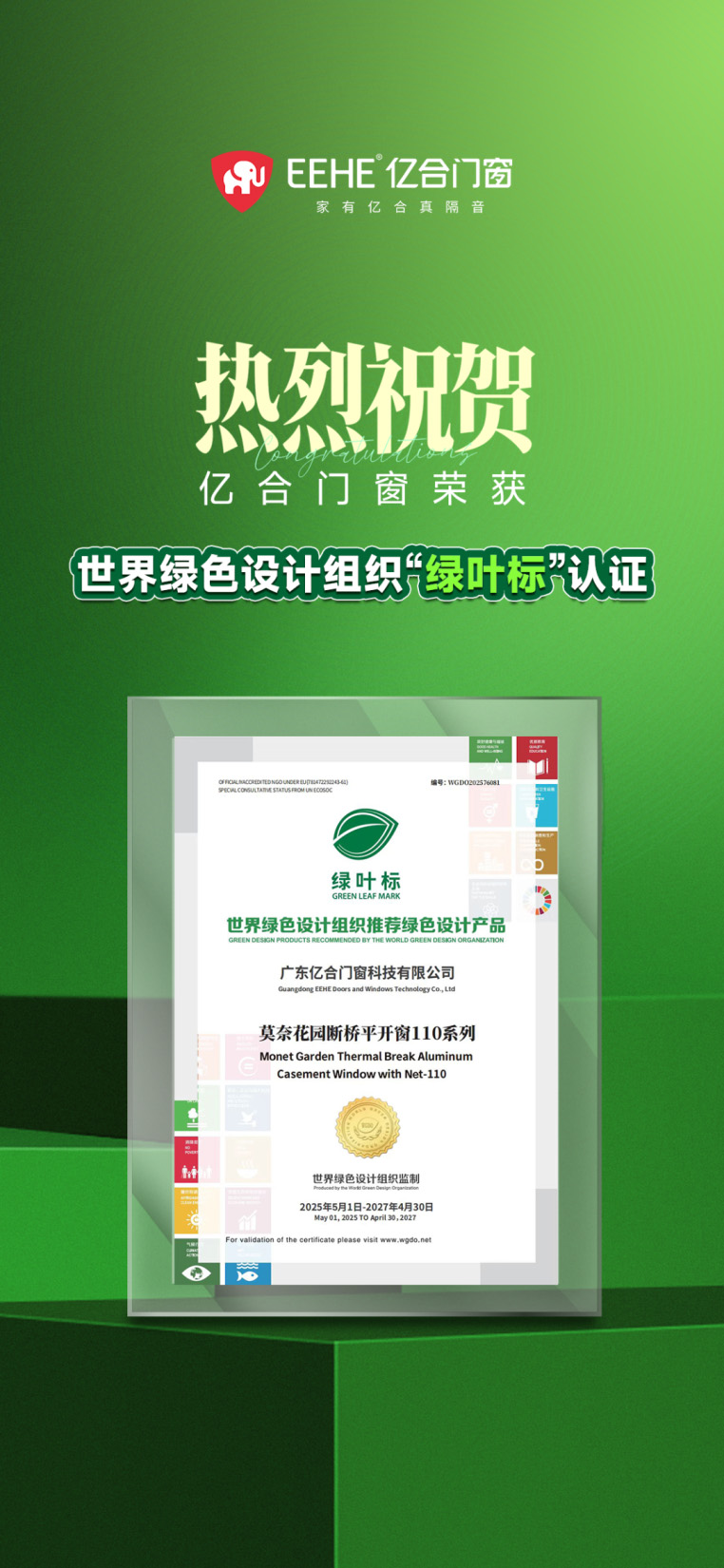 近日,億合門窗「莫奈花園」平開窗產(chǎn)品經(jīng)世界綠色設(shè)計(jì)組織(WGDO)評估中心專家評審,榮獲“綠葉標(biāo)”評定?!熬G葉標(biāo)”全稱為“世界綠色設(shè)計(jì)組織推薦綠色設(shè)計(jì)產(chǎn)品”,由世界綠色設(shè)計(jì)組織聯(lián)合國際行業(yè)協(xié)會建立,是全球首個(gè)以綠色設(shè)計(jì)為產(chǎn)品評定依據(jù)的標(biāo)識。