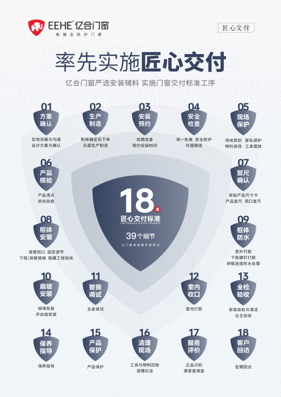 同時(shí),安裝規(guī)范是“匠心交付”的重中之重。億合門窗制定18道交付標(biāo)準(zhǔn)、39個(gè)質(zhì)量細(xì)節(jié),從測量設(shè)計(jì)到驗(yàn)收保養(yǎng)的全流程規(guī)范,確保每一扇門窗的安裝都“有章可循”。例如,標(biāo)準(zhǔn)化的密封系統(tǒng)杜絕滲漏風(fēng)險(xiǎn),專業(yè)工具保障安裝精度,透明化的驗(yàn)收流程讓用戶清晰掌握進(jìn)度。并以服務(wù)保障體系構(gòu)建起長效信任機(jī)制:億合承諾10年質(zhì)保,終身維護(hù),解決用戶后顧之憂。億合門窗正是這樣通過系統(tǒng)性構(gòu)建“三防三隔”+“匠心交付”的“6+1全防護(hù)體系”,讓每一扇門窗的安裝,都成為品質(zhì)與安心的保障;讓交付不再是終點(diǎn),而是持續(xù)服務(wù)的起點(diǎn)。