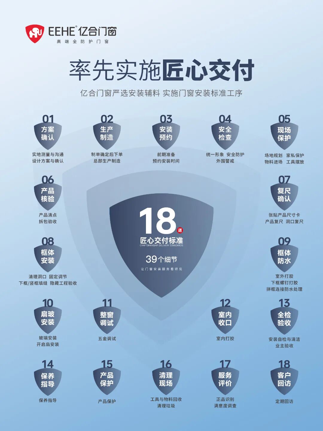 門窗產(chǎn)品的卓越性能,需依托專業(yè)交付服務(wù)才能充分實現(xiàn)。億合門窗率先實施“匠心交付”服務(wù)體系,以18道交付標(biāo)準(zhǔn)、39個質(zhì)量細(xì)節(jié)貫穿售前到售后全流程,做到“產(chǎn)品 + 服務(wù)”的一體化保障。