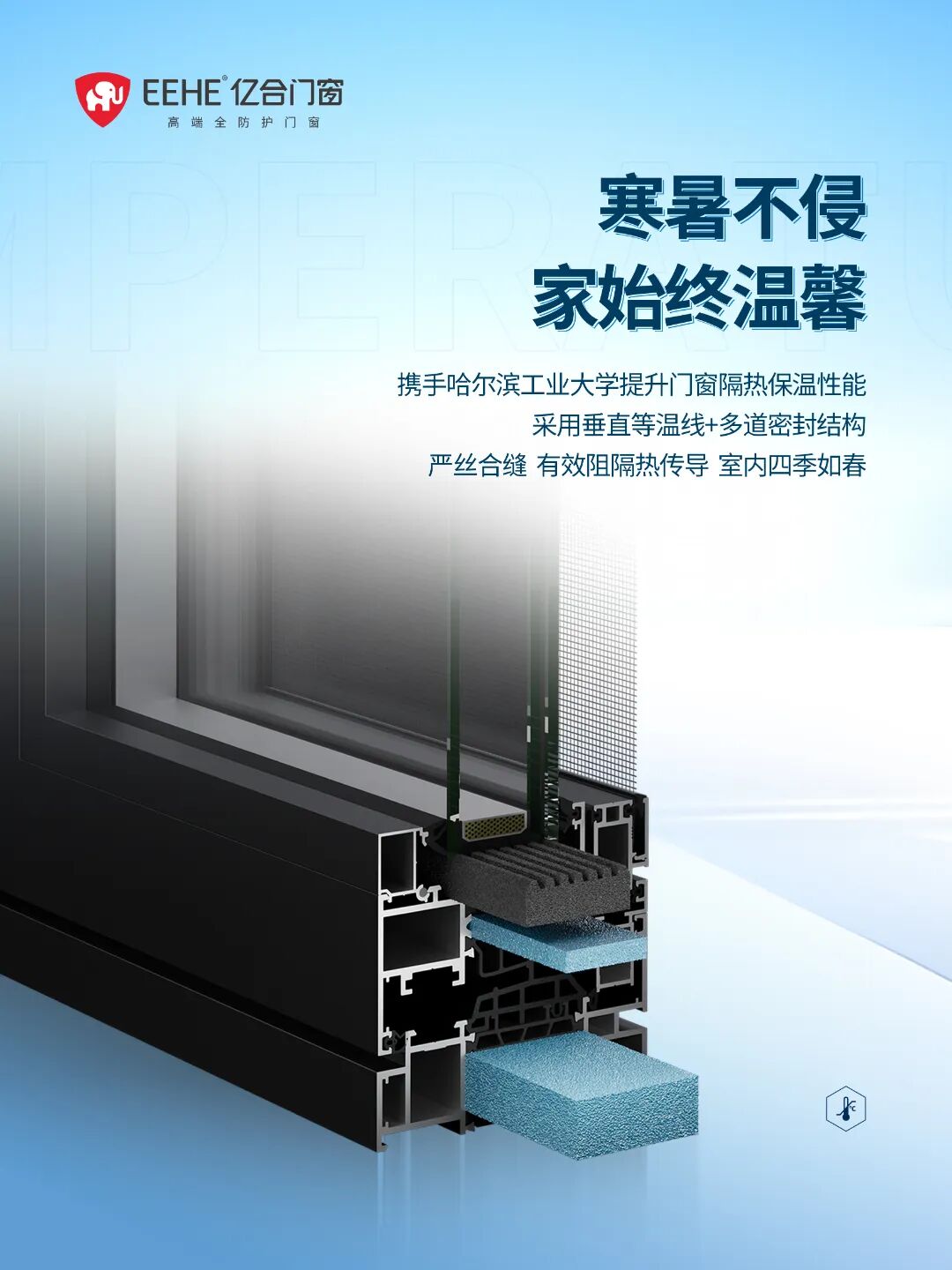 科學(xué)守護(hù),源于雙重防線。門窗的隔熱保溫性能對室內(nèi)溫度影響較大,更是節(jié)能降耗的關(guān)鍵。億合門窗攜手哈爾濱工業(yè)大學(xué)攻克門窗隔熱難題,通過多次研發(fā)測試,采集多組環(huán)境與性能關(guān)聯(lián)數(shù)據(jù),以多腔體內(nèi)的垂直等溫線設(shè)計,配合PA66超寬隔熱條、無縫焊接工藝與三道密封結(jié)構(gòu),從源頭阻斷熱量傳導(dǎo),顯著提升門窗隔熱保溫性能。