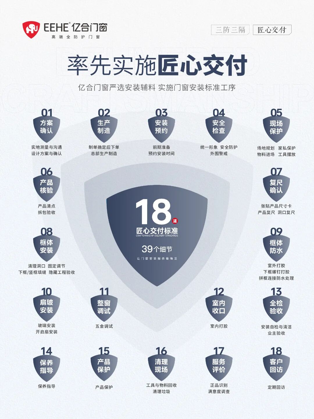 為了構(gòu)建從產(chǎn)品生產(chǎn)到安裝交付的完整閉環(huán),讓門窗達(dá)到最佳防護(hù)作用,億合門窗率先實(shí)施“匠心交付”安裝標(biāo)準(zhǔn),制定18道標(biāo)準(zhǔn)化交付流程、39個質(zhì)量管控細(xì)節(jié),覆蓋上門測量、方案設(shè)計、生產(chǎn)制造、專業(yè)安裝、售后維護(hù)、定期回訪全周期。通過標(biāo)準(zhǔn)化施工、專業(yè)化服務(wù)、精細(xì)化管控,切實(shí)解決用戶在門窗選購、安裝、使用中的各類難題,真正做到讓消費(fèi)者買得放心、用得安心,以標(biāo)桿級服務(wù)推動行業(yè)健康有序發(fā)展。