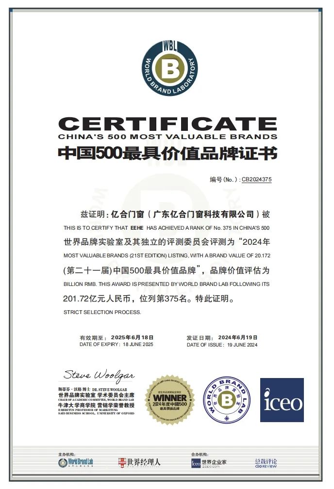 6月19日,由世界品牌實驗室(World Brand Lab)主辦的第二十一屆“世界品牌大會”盛大舉行,會上重磅發(fā)布了2024《中國500最具價值品牌》報告,其中,億合門窗以201.72億元的品牌價值位列第375名,與國家電網(wǎng)、中國工商銀行、海爾、中國石油、騰訊、華為等品牌共同上榜,彰顯了中國門窗品牌的強勁實力。