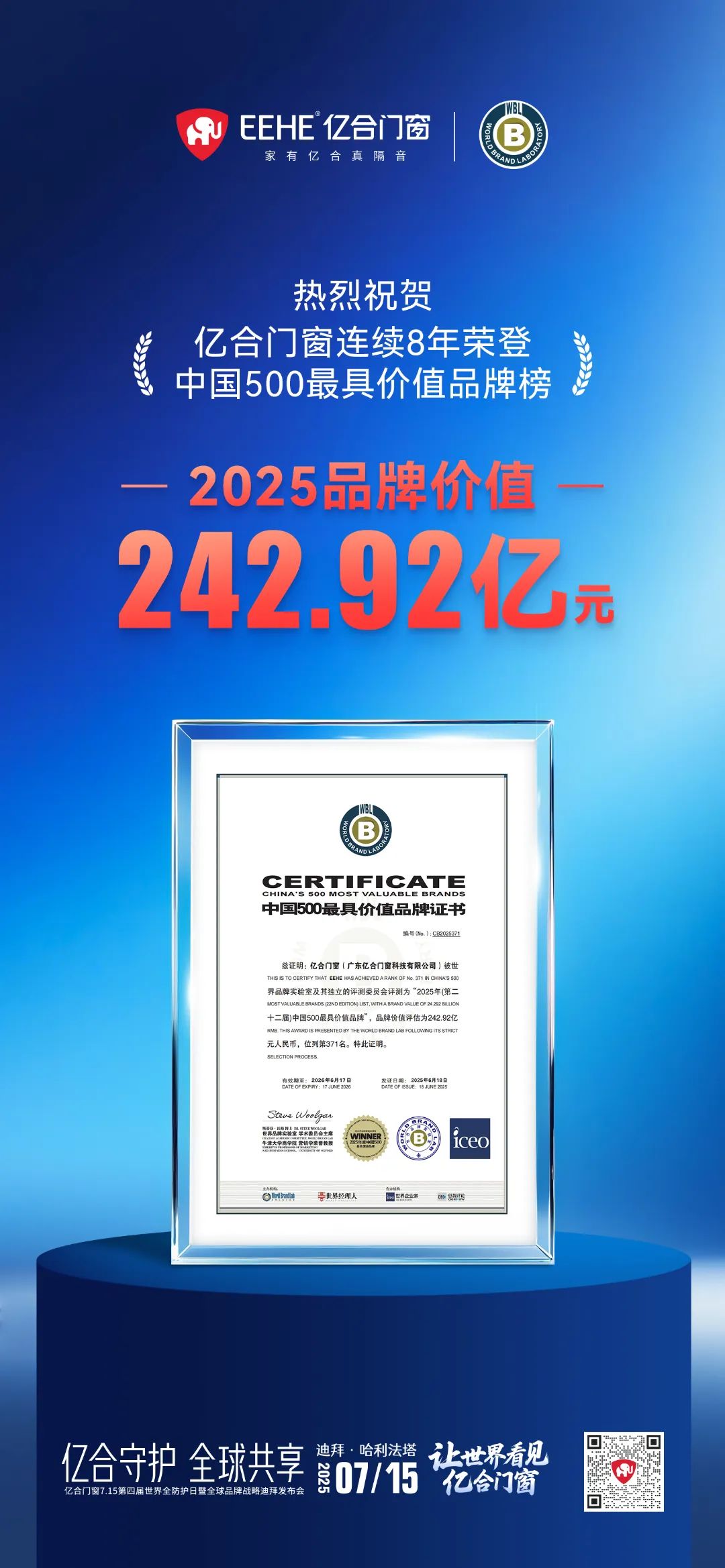 如今,億合門窗連續(xù)8年榮登「中國 500 最具價值品牌榜」,成為品牌發(fā)展歷程中的重要里程碑。站在新的起點上,億合門窗即將開啟全新篇章:7月15日,億合守護·全球共享——億合門窗7.15第四屆世界全防護日暨全球品牌戰(zhàn)略迪拜發(fā)布會將在迪拜?哈利法塔盛大召開。在這座全球地標(biāo)之上,億合門窗將展現(xiàn)創(chuàng)新成果與全球品牌戰(zhàn)略規(guī)劃,我們誠邀您共同見證億合門窗的榮耀時刻,期待與您不見不散!