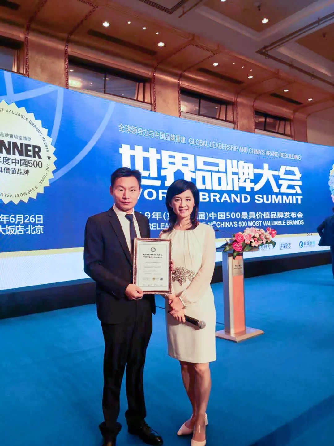 億合門(mén)窗常務(wù)副總經(jīng)理胡超先生應(yīng)邀出席大會(huì),并親手接過(guò)由牛津大學(xué)(Oxford)賽德商學(xué)院教授理查德·惠廷頓(Richard Whittington)與倫敦大學(xué)學(xué)院管理學(xué)院(UCL)的教授馬丁·奇達(dá)夫( Martin Kilduff)共同親手頒發(fā)的《中國(guó)500最具價(jià)值品牌》證書(shū)。