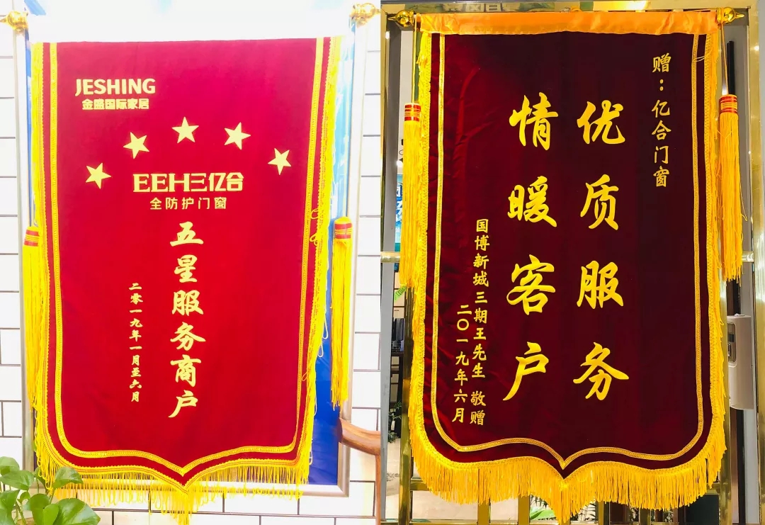 國博新城三期王先生贈與的優(yōu)質(zhì)服務(wù)、情暖客戶的錦旗、金盛國際家居首次頒發(fā)的五星服務(wù)商戶錦旗、億合門窗頒發(fā)的最佳業(yè)績獎(jiǎng).......