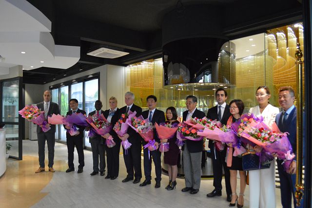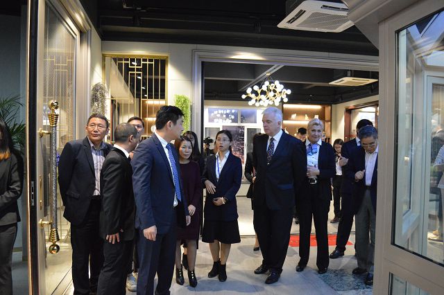 大使一行在鮮花簇?fù)硐聟⒂^了億合門窗展廳。億合門窗精湛的產(chǎn)品設(shè)計(jì)工藝、過硬的產(chǎn)品質(zhì)量與豐富的產(chǎn)品線使得大使與參贊們紛紛駐足品鑒。