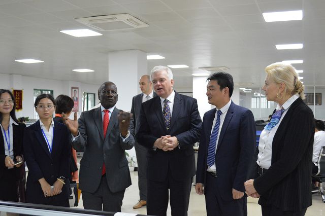 11月15日,中國前駐柬埔寨、新加坡和泰國大使傅學(xué)章,商務(wù)部中國國際經(jīng)濟(jì)合作學(xué)會副秘書長、對外交流中心主任戴緒龍,斯洛伐克駐華大使杜尚-貝拉及夫人,納米比亞駐華大使埃利-喬治、葡萄牙駐華大使館參贊康博斯、匈牙利駐華大使館參贊高博-賽蓋伊等一行蒞臨億合門窗參觀指導(dǎo)。億合門窗董事長曾奎及夫人、億合門窗常務(wù)副總經(jīng)理胡超先生等公司領(lǐng)導(dǎo)熱情接待并陪同考察。