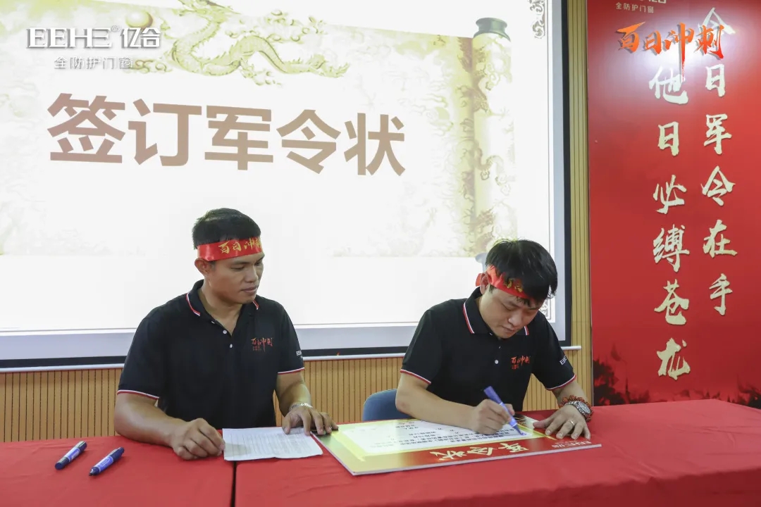 目標(biāo)已鎖定,戰(zhàn)鼓已敲響!伴隨著氣勢磅礴的鼓聲,各經(jīng)銷商戰(zhàn)士帶著必勝的決心,簽訂“軍令狀”,并激昂嘹亮地上臺(tái)宣誓并喝下壯行酒。錚錚誓言,響徹全場。“軍令狀”的簽訂,徹底吹響了百日沖刺的沖鋒號,激勵(lì)著億合門窗經(jīng)銷商戰(zhàn)士們以更飽滿的熱情投入到終端銷售工作中,市場就是戰(zhàn)場,箭在弦上,即刻沖刺!