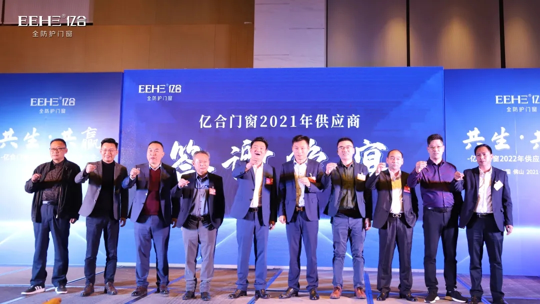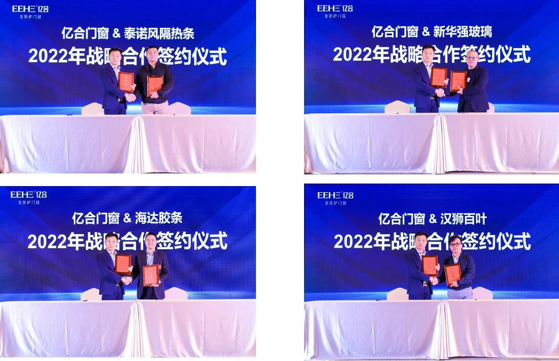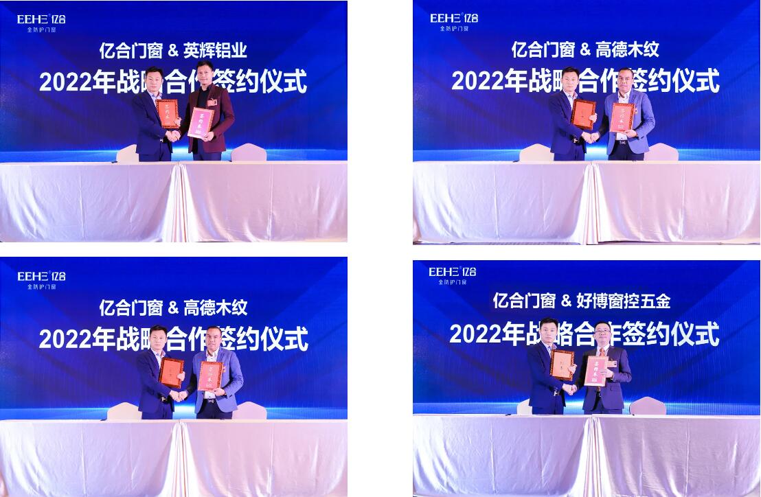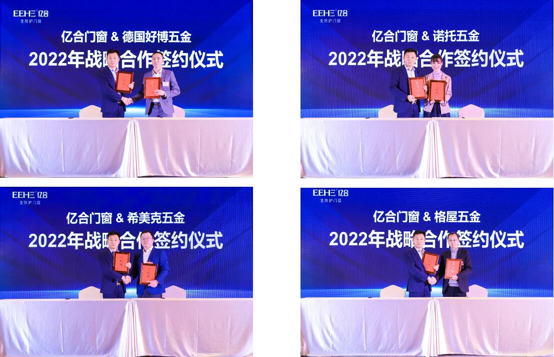 本次大會(huì)上,公司總經(jīng)理胡超親自同英輝鋁業(yè)、中聯(lián)鋁業(yè)、高德木紋、德國好博五金、德國諾托五金、德國格屋五金、泰諾風(fēng)隔熱條、海達(dá)膠條、希美克五金、好博窗控、新華強(qiáng)玻璃、漢獅百葉等12家供應(yīng)商簽訂了2022年戰(zhàn)略合作協(xié)議。