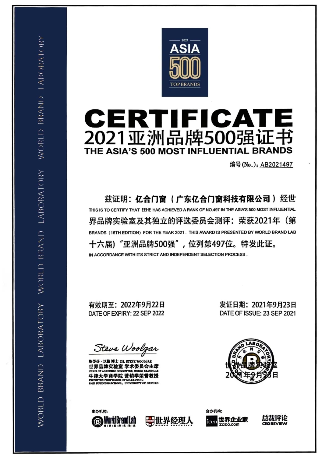 9月23日,亞洲品牌大會在上海召開,億合門窗入選“亞洲品牌500強”。