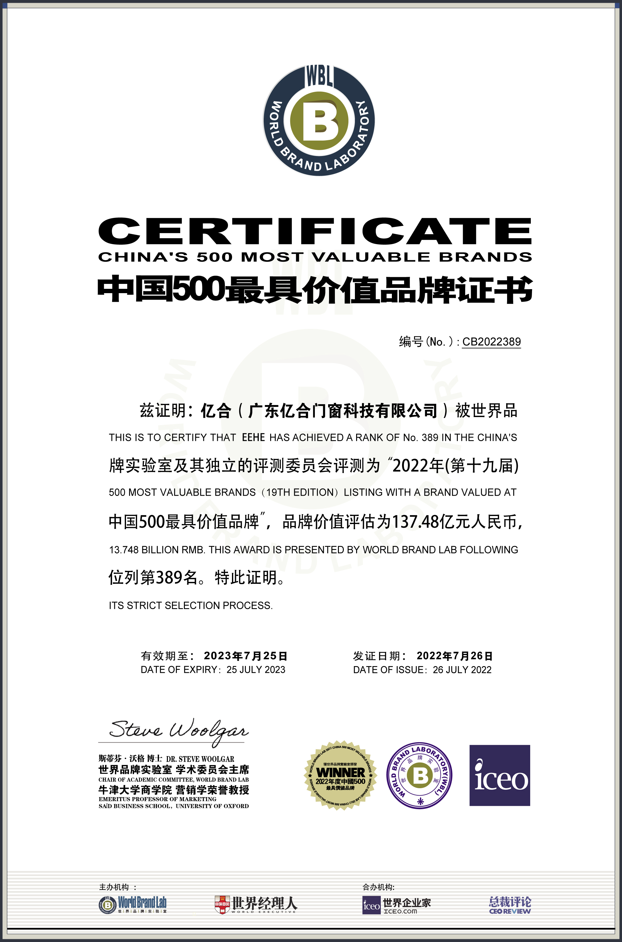 在這份基于品牌強(qiáng)度、財(cái)務(wù)數(shù)據(jù)和消費(fèi)者行為分析的年度報(bào)告中,億合門窗以137.48億元品牌價(jià)值榮登本年度最具價(jià)值品牌389位,這是億合門窗連續(xù)五年邁進(jìn)世界級品牌陣營,也是億合門窗連續(xù)第五次與國家電網(wǎng)、中國工商銀行、海爾、騰訊、中國人壽等品牌共同入選《中國500最具價(jià)值品牌》。