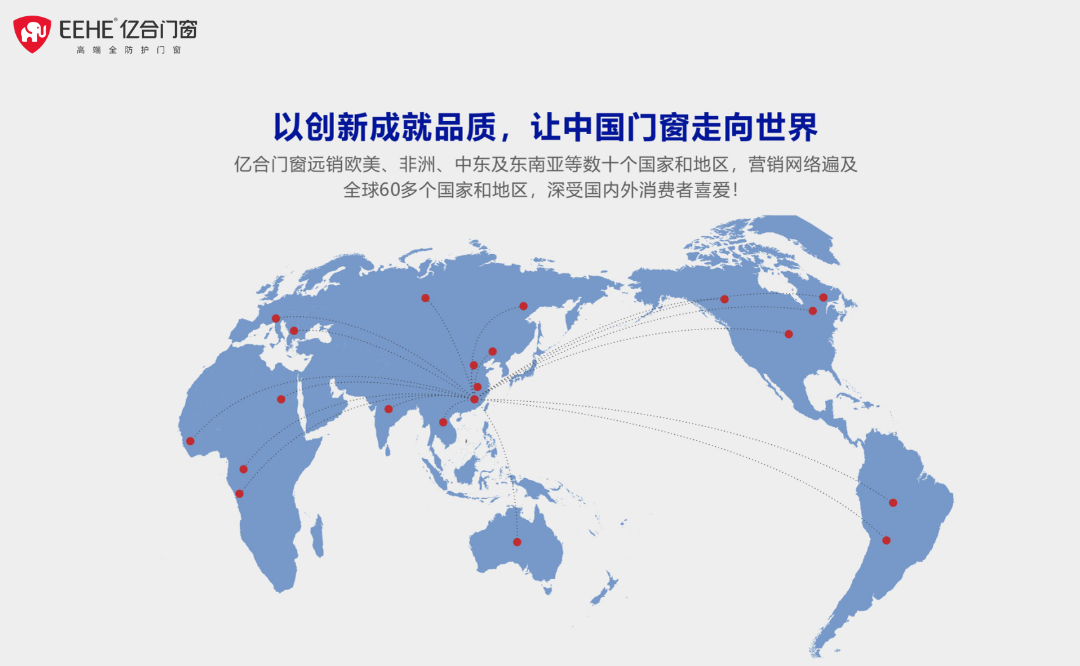 世界門(mén)窗看中國(guó),中國(guó)門(mén)窗看廣東!億合門(mén)窗產(chǎn)品已遠(yuǎn)銷(xiāo)歐美、非洲、中東及東南亞等地區(qū),營(yíng)銷(xiāo)網(wǎng)絡(luò)遍及全球60個(gè)國(guó)家,深受?chē)?guó)內(nèi)外消費(fèi)者喜愛(ài)與信賴(lài)!
