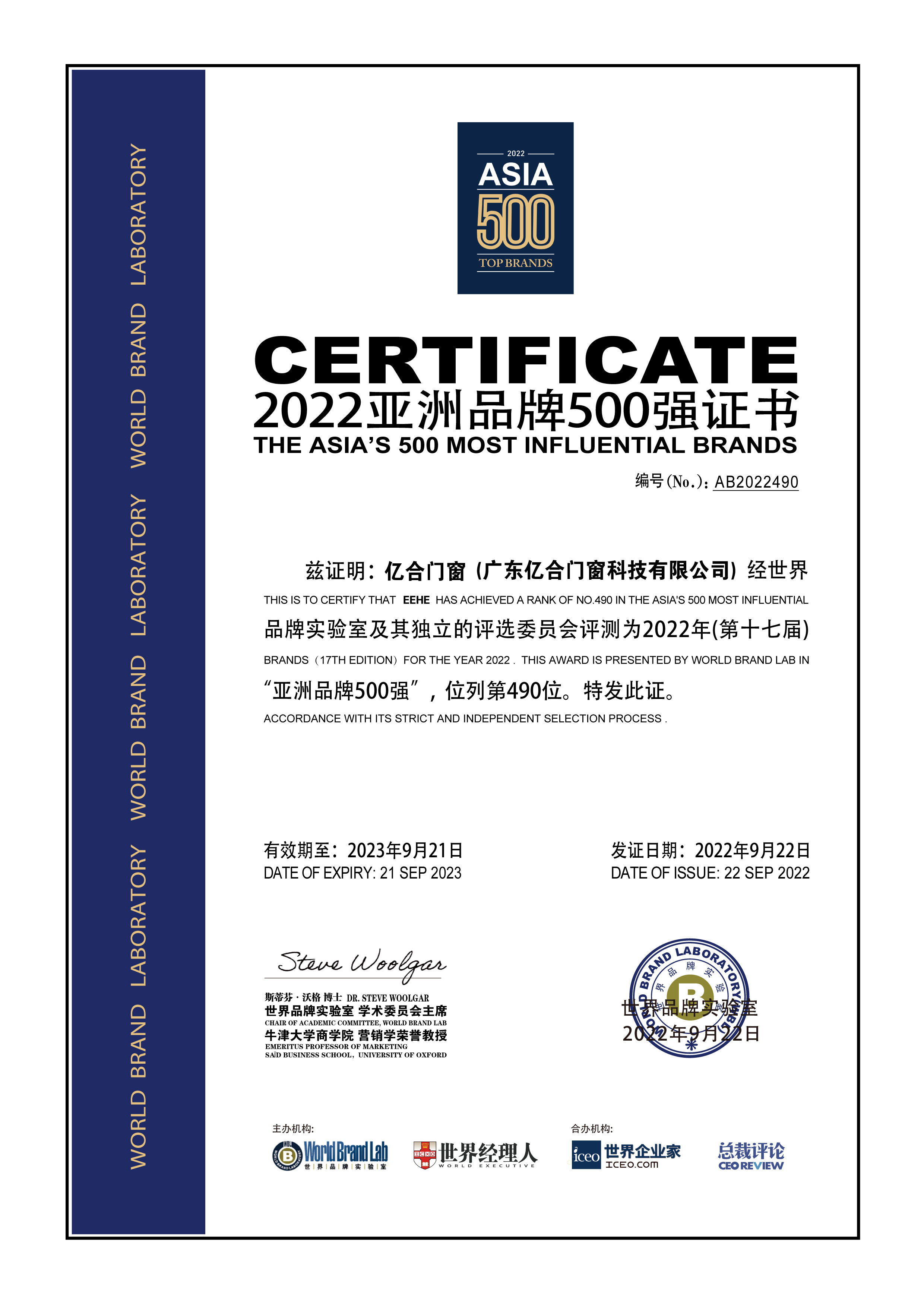 9月22日,由世界品牌實(shí)驗(yàn)室(World Brand Lab)主辦的“亞洲品牌大會(huì)”在上海隆重召開(kāi)。會(huì)上發(fā)布了2022年《亞洲品牌500強(qiáng)》排行榜,這是世界品牌實(shí)驗(yàn)室第十七次對(duì)亞洲品牌影響力進(jìn)行的測(cè)評(píng), 共有20個(gè)國(guó)家和地區(qū)的500個(gè)品牌入選。億合門窗以雄厚的綜合實(shí)力,在數(shù)以萬(wàn)計(jì)的企業(yè)中脫穎而出,再度蟬聯(lián)“亞洲品牌500強(qiáng)”榮譽(yù),星耀亞洲,璀璨全球!