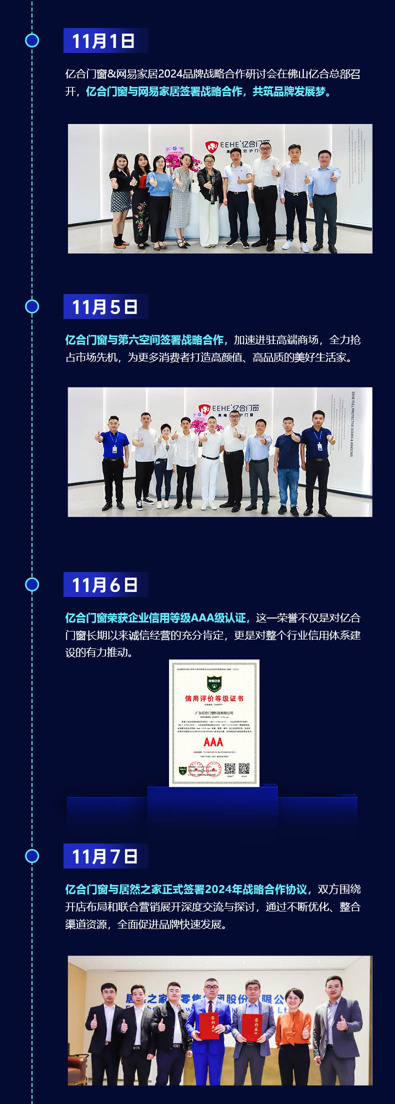11月9日: 居然之家執(zhí)行總裁王寧一行到訪億合門窗佛山總部,億合門窗董事長曾奎攜高管團隊陪同參觀考察,并對億合門窗三防三隔研發(fā)技術(shù)、博士后科研工作站、歷經(jīng)15年打造的極致產(chǎn)品和匠心交付等做詳細講解,并對未來品牌規(guī)劃和營銷推廣做深入溝通交流,雙方共同制定2024開店布局和聯(lián)合營銷年度計劃。