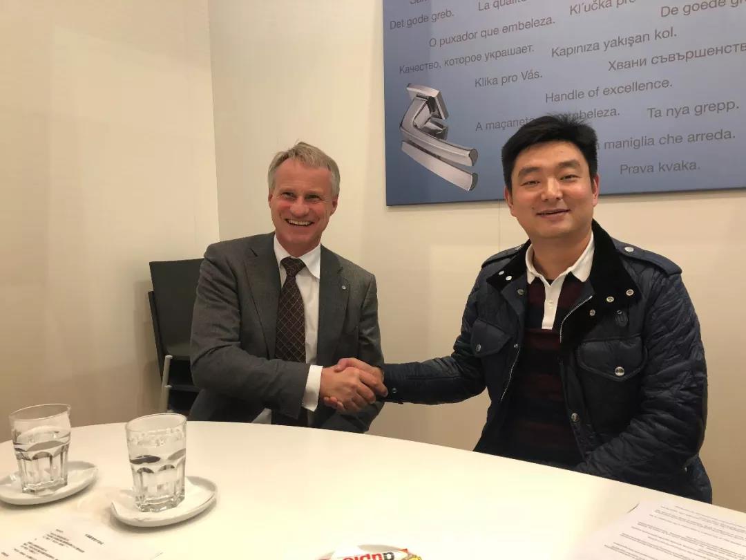 1月15日,經(jīng)過充分的考察和交流,在慕尼黑展會上,廣東省門窗協(xié)會會長、億合門窗董事長曾奎先生同德國HOPPE好博集團(tuán)第二代所有者Christoph Hoppe克里斯托弗·好博先生、亞太區(qū)總裁Eric Kersten先生,就定制億合專屬五金達(dá)成了合作協(xié)議,并現(xiàn)場舉行了簡單而隆重的簽約儀式。