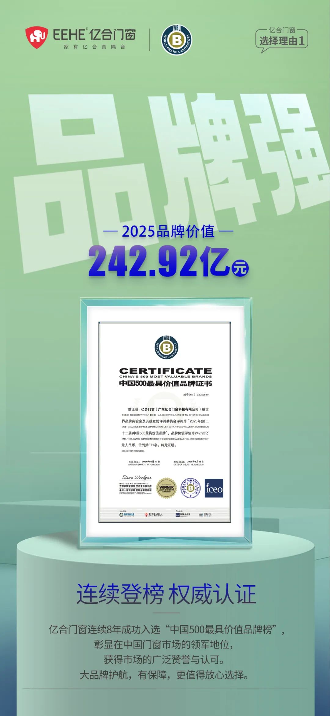 榮譽(yù)加冕 | 億合門窗連續(xù)8年穩(wěn)居「中國 500 最具價(jià)值品牌榜」