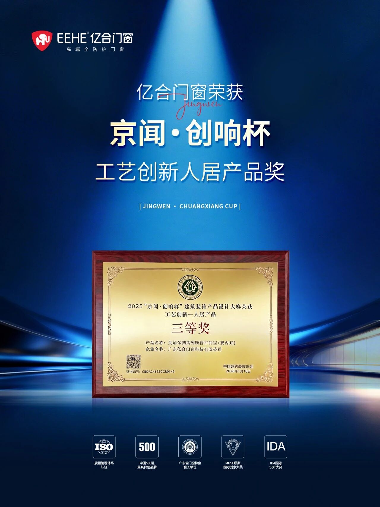 1月16日,由中國建筑裝飾協(xié)會主辦,中國建筑裝飾協(xié)會材料應(yīng)用分會、廣東京聞傳媒有限公司聯(lián)合承辦的“2026建筑裝飾流行趨勢發(fā)布大會暨2025‘京聞·創(chuàng)響杯’建筑裝飾產(chǎn)品設(shè)計大賽”頒獎典禮,在北京全國人大會議中心隆重舉行。億合門窗「貝加爾湖」平開窗憑借精湛工藝與人文設(shè)計,榮獲“工藝創(chuàng)新—人居產(chǎn)品”三等獎,彰顯在門窗領(lǐng)域的創(chuàng)新實力與匠心追求。